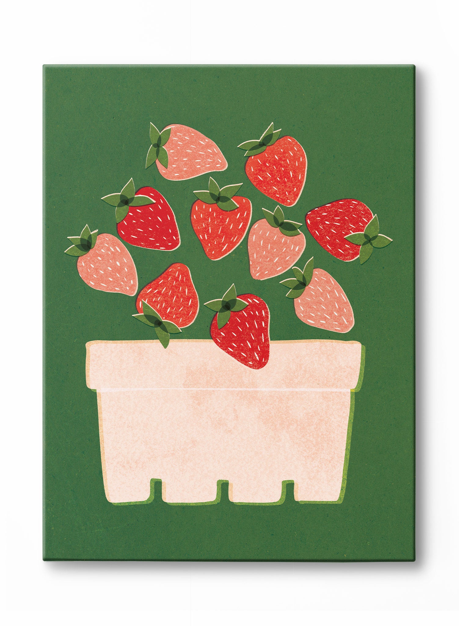 A carton overflowing with bright, juicy strawberries captures the essence of market mornings in this vibrant print. The deep green backdrop sets off the warm reds and soft pinks of the fruit, while the painterly texture and simple shapes give the piece a handcrafted, screen-printed quality. The strawberries seem to spill out naturally, full of energy and charm.