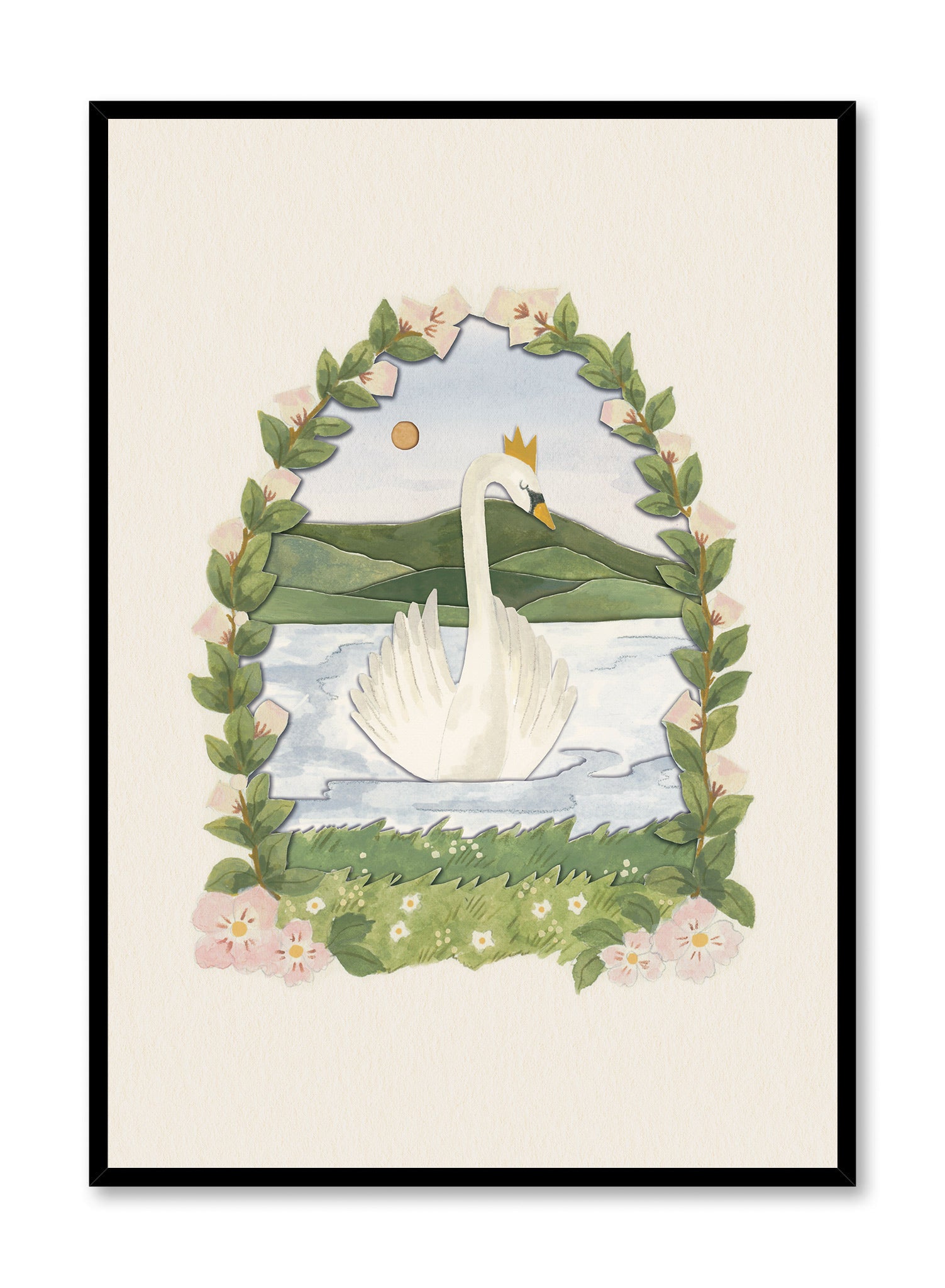 A serene swan glides gracefully across a tranquil lake, crowned with a golden tiara that catches the soft light of a setting sun. Encircled by a lush arch of green leaves and delicate pink blossoms, the scene evokes a sense of peaceful elegance. Rolling hills stretch into the distance, painted in gentle hues of green and blue, creating a backdrop that feels both timeless and inviting.