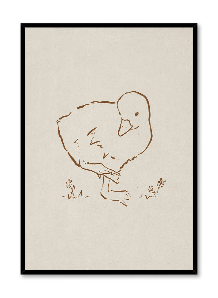 A charming duckling etched in warm sepia tones captures the simplicity of nature in this minimalist illustration. The delicate strokes highlight its soft features, while the muted beige background enhances the artwork’s quiet elegance.