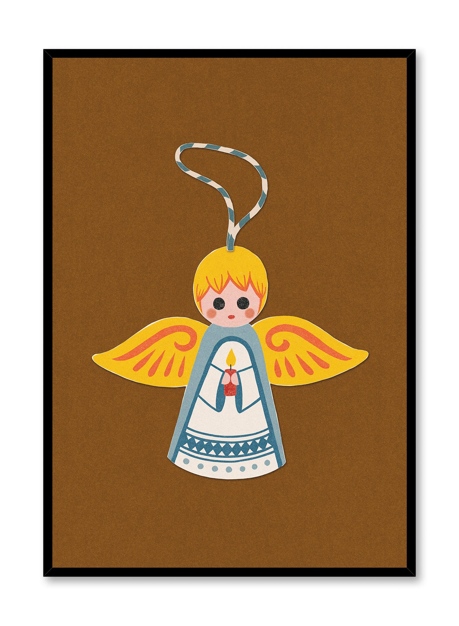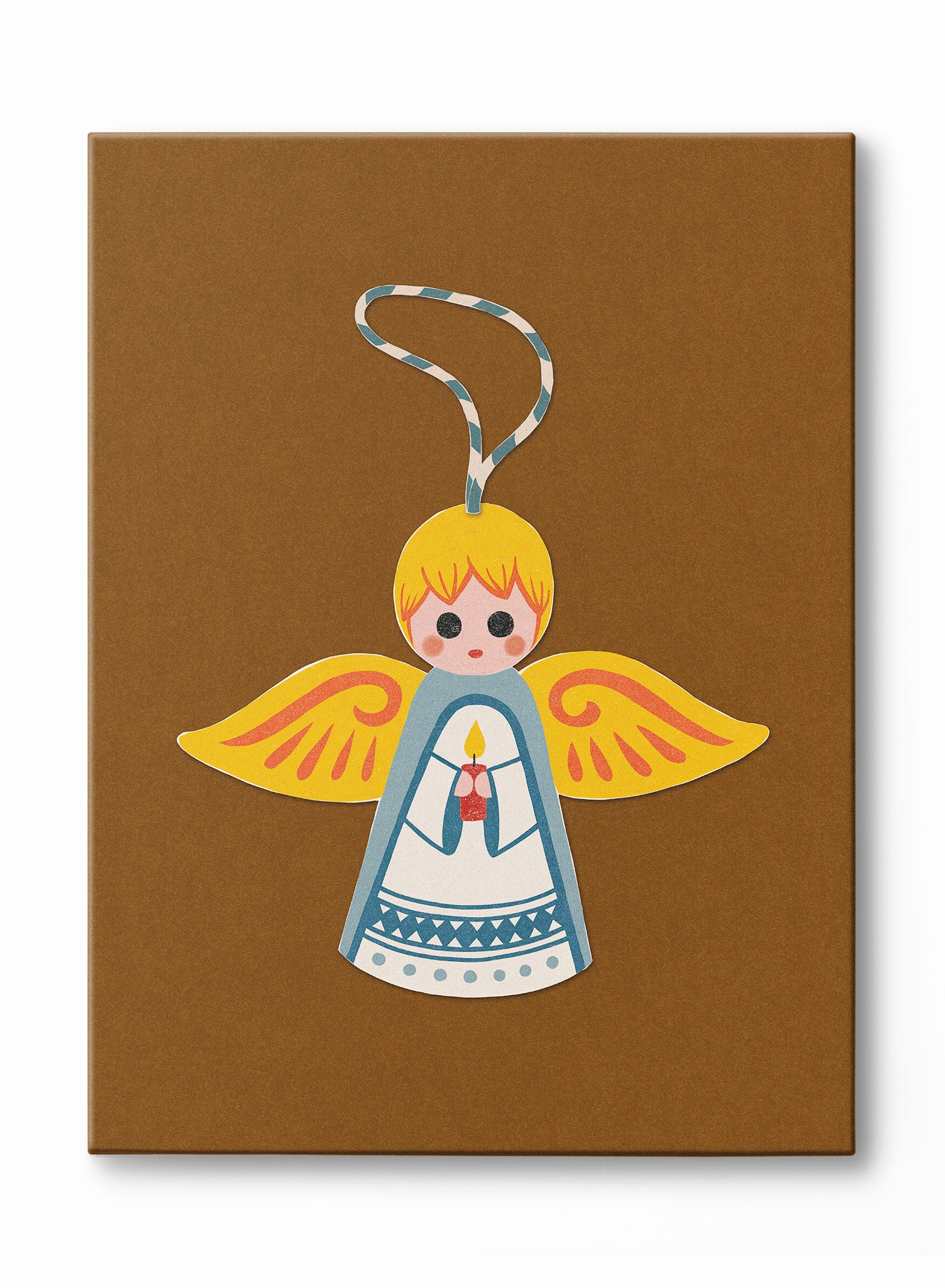 This charming print features a stylized angel ornament, adorned with bright yellow wings and a serene expression. The angel's robe is a soft blue, accented with intricate patterns, while a simple loop suggests it’s ready to hang. Set against a warm brown background, the piece exudes a sense of handcrafted nostalgia.