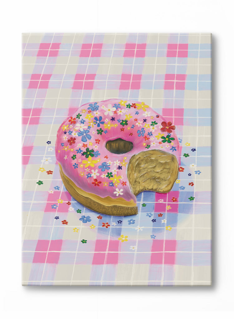 Just when you thought dessert couldn't get better... This retro canvas serves a pink glazed donut sprinkled with spring flowers over a pink and purple tablecloth.
