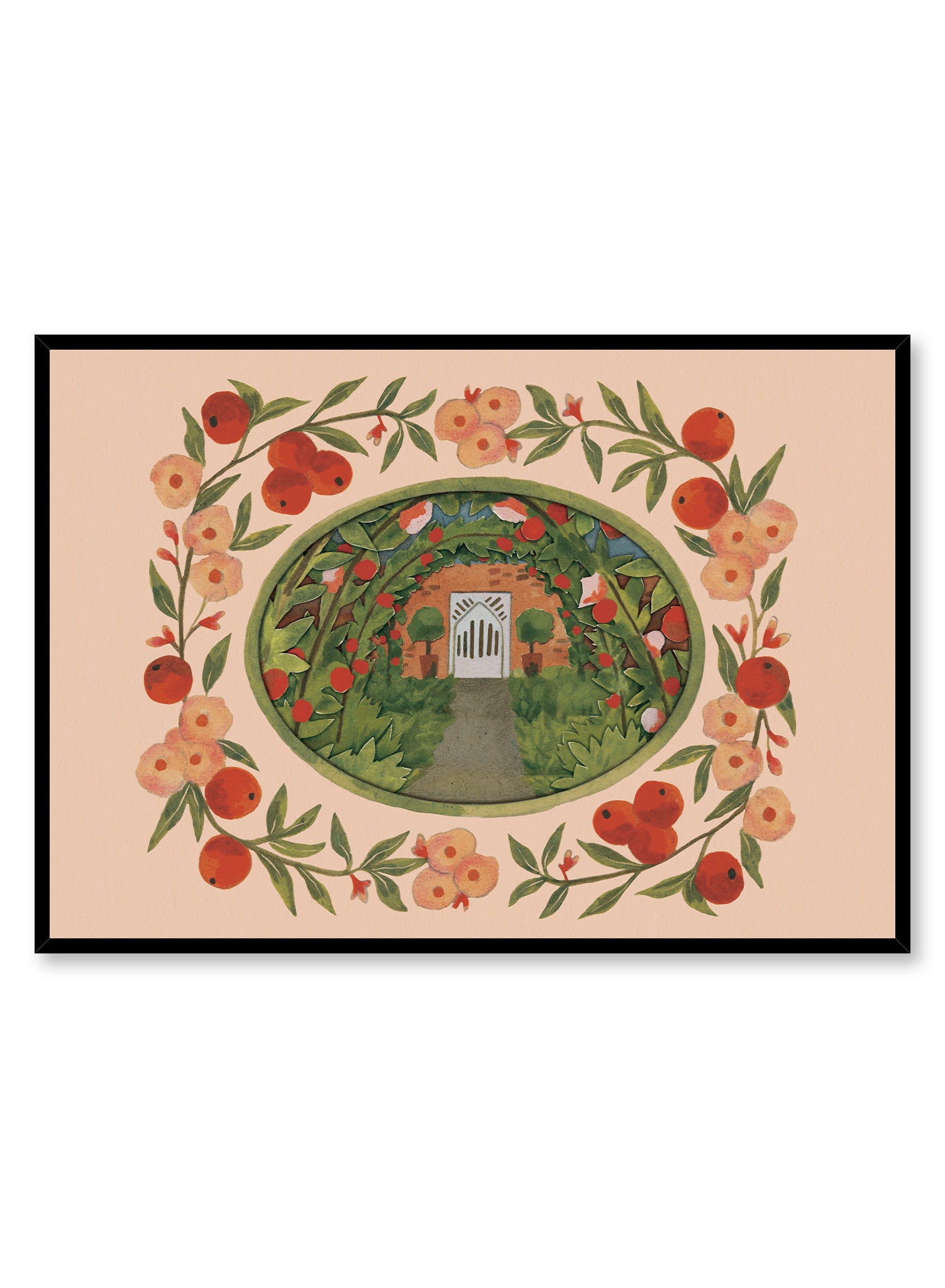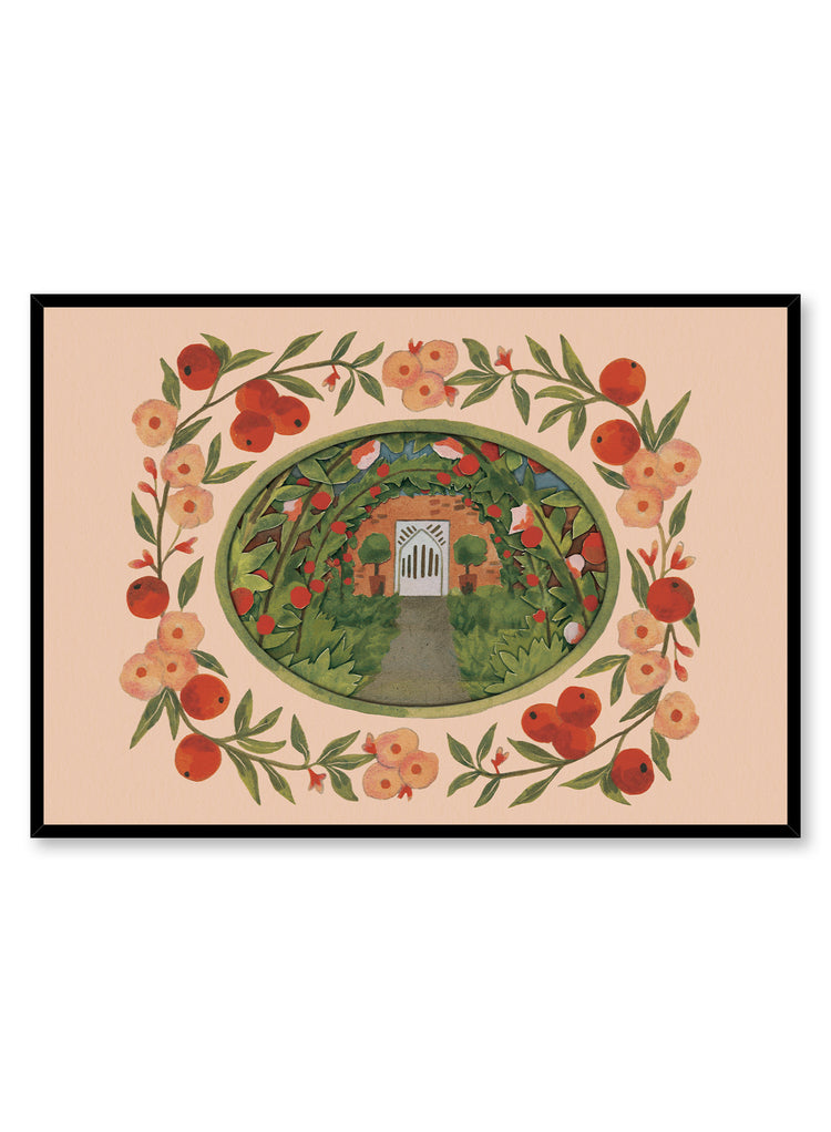 A quaint garden path leads to a charming white gate, framed by lush greenery and vibrant blooms. The scene is encircled by a delicate wreath of painted flowers and ripe red apples, set against a soft peach background. This print captures a moment of serene beauty, inviting viewers to imagine the stories that lie beyond the gate.