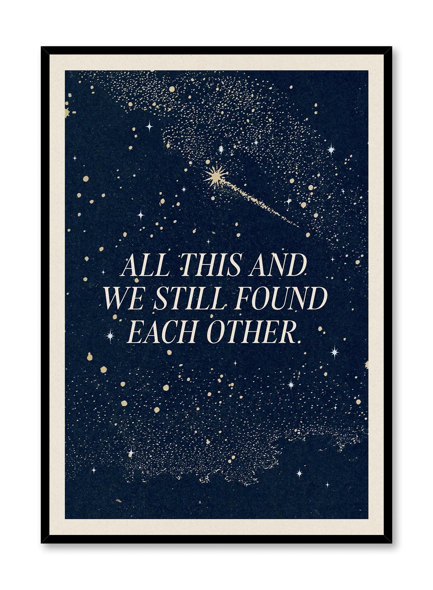 A deep indigo expanse defines this celestial print, scattered with golden stardust and a trailing shooting star. Centered in the cosmic scene, the serif typography reads ""All this and we still found each other,"" offering a poetic sentiment about connection. The slightly distressed texture gives the piece a lived-in quality, grounding the romantic message in something tangible and real.