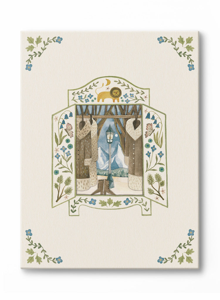A quaint scene unfolds within the frame, where a pair of cozy coats hang beside a window, revealing a serene winter landscape. Snow-capped mountains rise in the distance, framed by bare trees and a glowing streetlamp that casts a gentle light. The border is adorned with delicate floral motifs, adding a touch of nature’s grace to the composition. This canvas captures a moment of quiet anticipation, as if inviting you to step into a world of peaceful wonder.