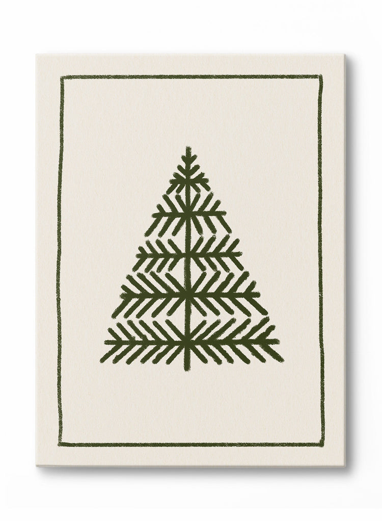 This canvas features a minimalist depiction of a stylized evergreen tree, rendered in deep forest green against a soft, cream background. The tree's geometric branches form a symmetrical pattern, enclosed by a simple border that adds a touch of refinement to the composition.