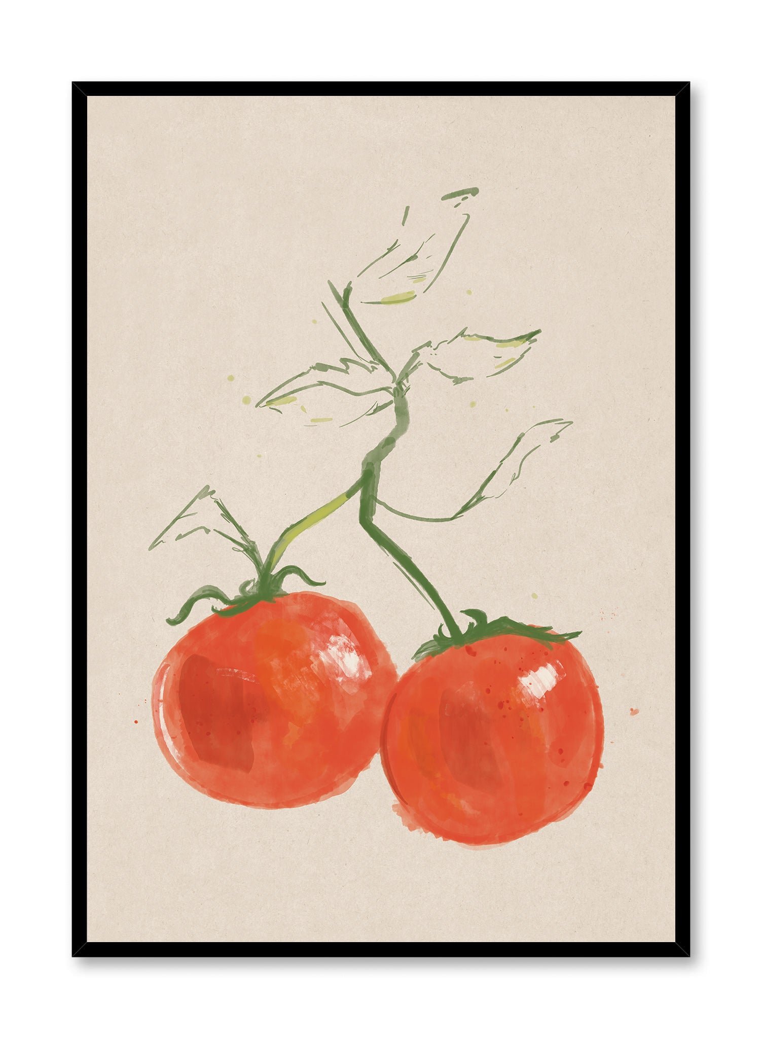 A pair of ripe, sun-kissed tomatoes dangle from their vine in this expressive watercolor-style print. The loose brushstrokes and delicate splashes of green and red bring a fresh, organic feel, as if the tomatoes were just plucked from the garden. The vibrant red hues contrast beautifully against the soft neutral background, creating a composition that feels both lively and effortless.