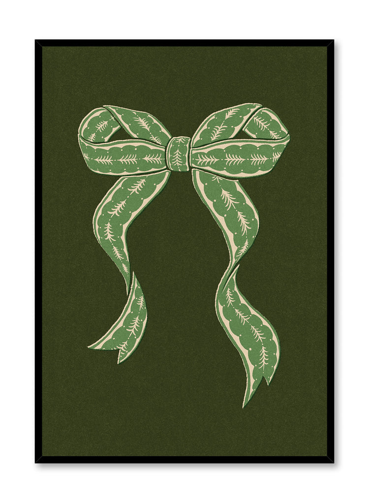 This print features a beautifully detailed green bow, adorned with intricate patterns reminiscent of evergreen branches. Set against a deep, rich background, the bow's elegant curves and delicate design evoke a sense of festive charm and natural beauty. The simplicity of the composition allows the bow to take center stage, creating a striking visual impact.