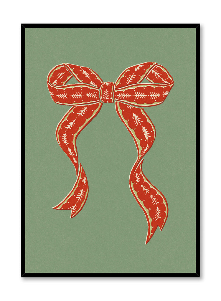 This print features a striking red bow adorned with intricate white patterns, set against a muted green background. The bow's flowing ribbons and detailed design evoke a sense of festive charm, capturing the spirit of holiday traditions with a modern twist.