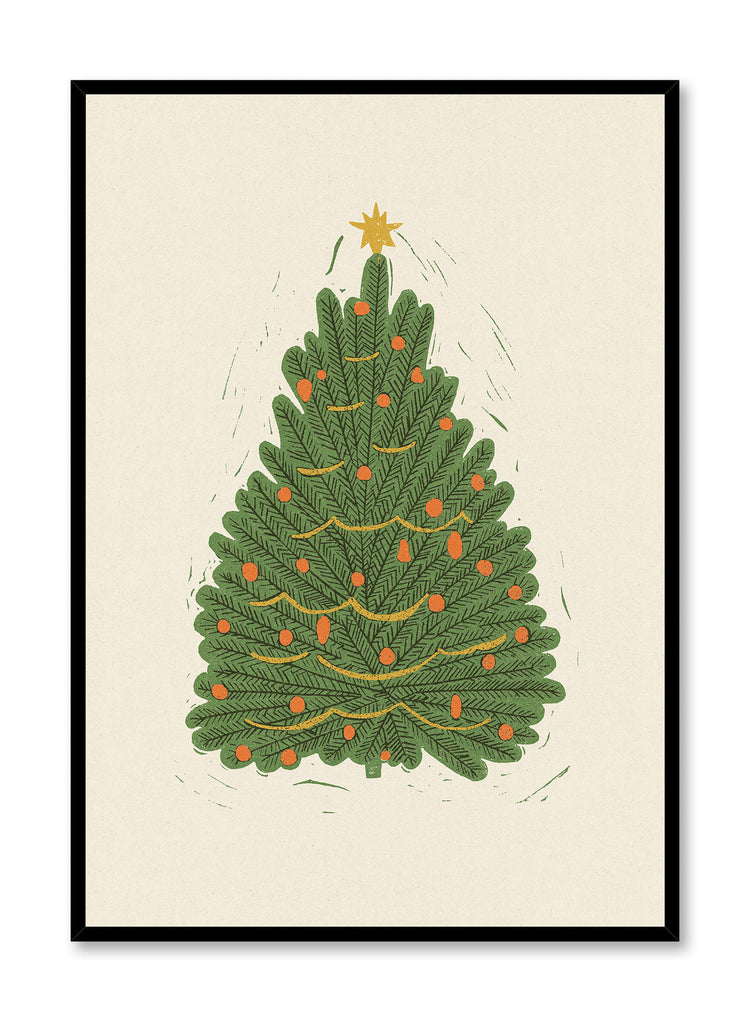 This print features a charming Christmas tree adorned with bright orange baubles and topped with a golden star. The tree's lush green branches are intricately detailed, creating a sense of depth and texture against the soft, neutral background. The simplicity of the design captures the festive spirit in a fresh, modern way.