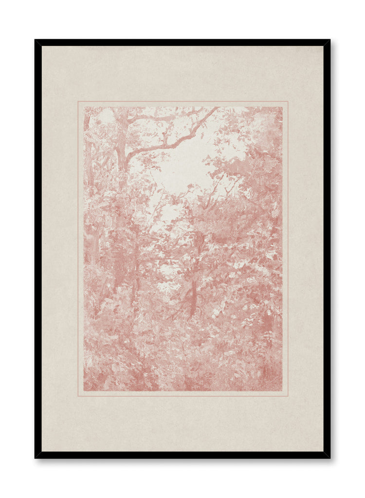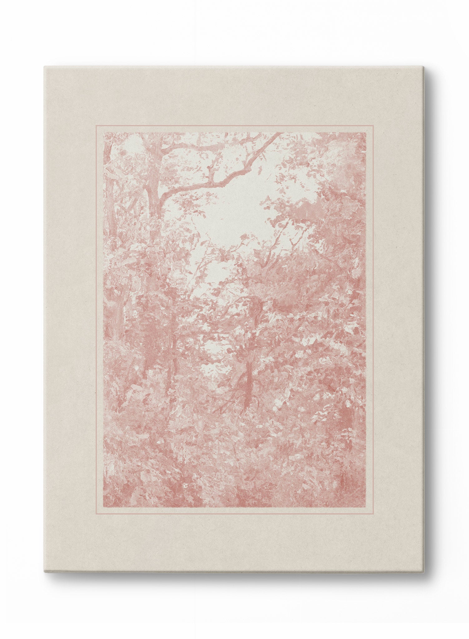 This dreamy art print features a forest bathed in soft blush tones, creating an ethereal and romantic atmosphere. The intricate layering of foliage and branches adds depth, while the warm hues evoke a sense of gentle nostalgia. The simplicity of the scene allows the delicate color palette to take center stage.
