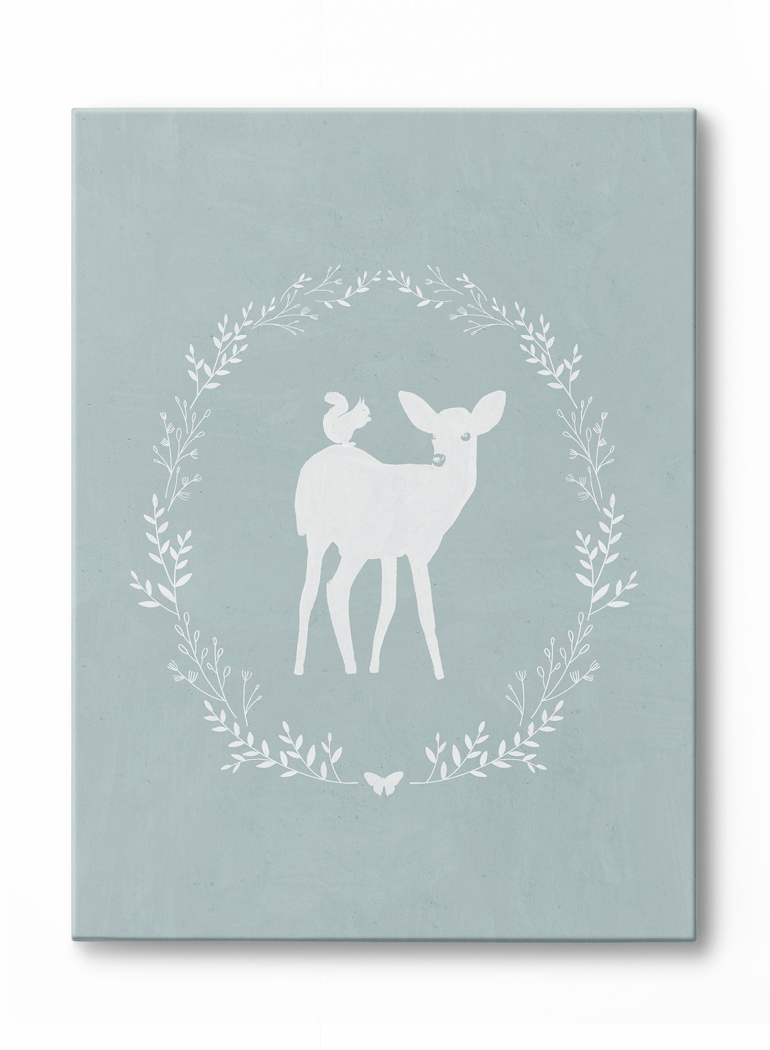 A gentle deer and squirrel silhouette stand within an intricate wreath of flora, set against a soft blue-gray backdrop. This piece radiates charm and nostalgia, evoking the innocence of classic storybook illustrations.